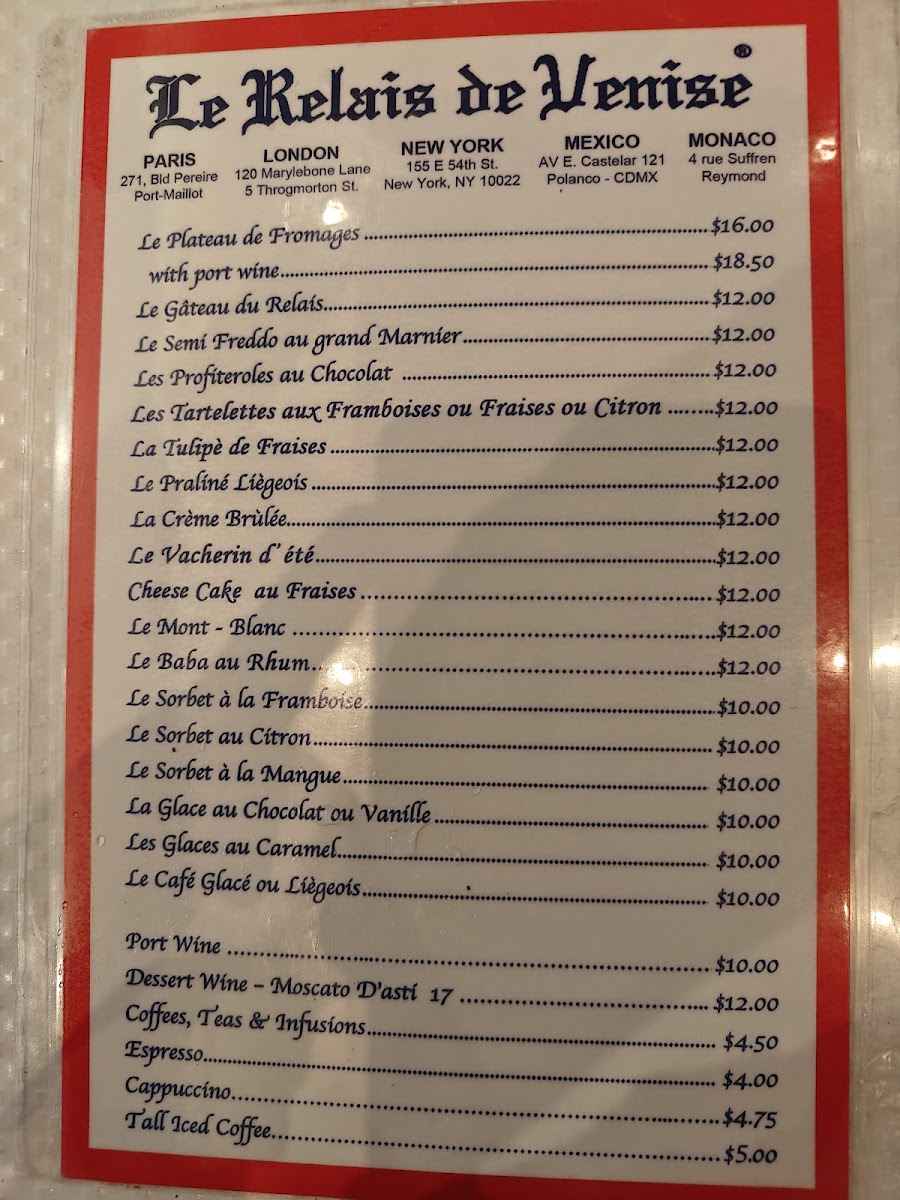 For dessert, the restaurant offers an array of delightful options, including Le Gâteau Du Relais at $10.50, Les Profiteroles Au Chocolat at $10.75, and La Crème. Make sure to save room; Mariya Okhten recommends pairing the sweet Porto wine with dessert for an absolutely divine finish to your meal.